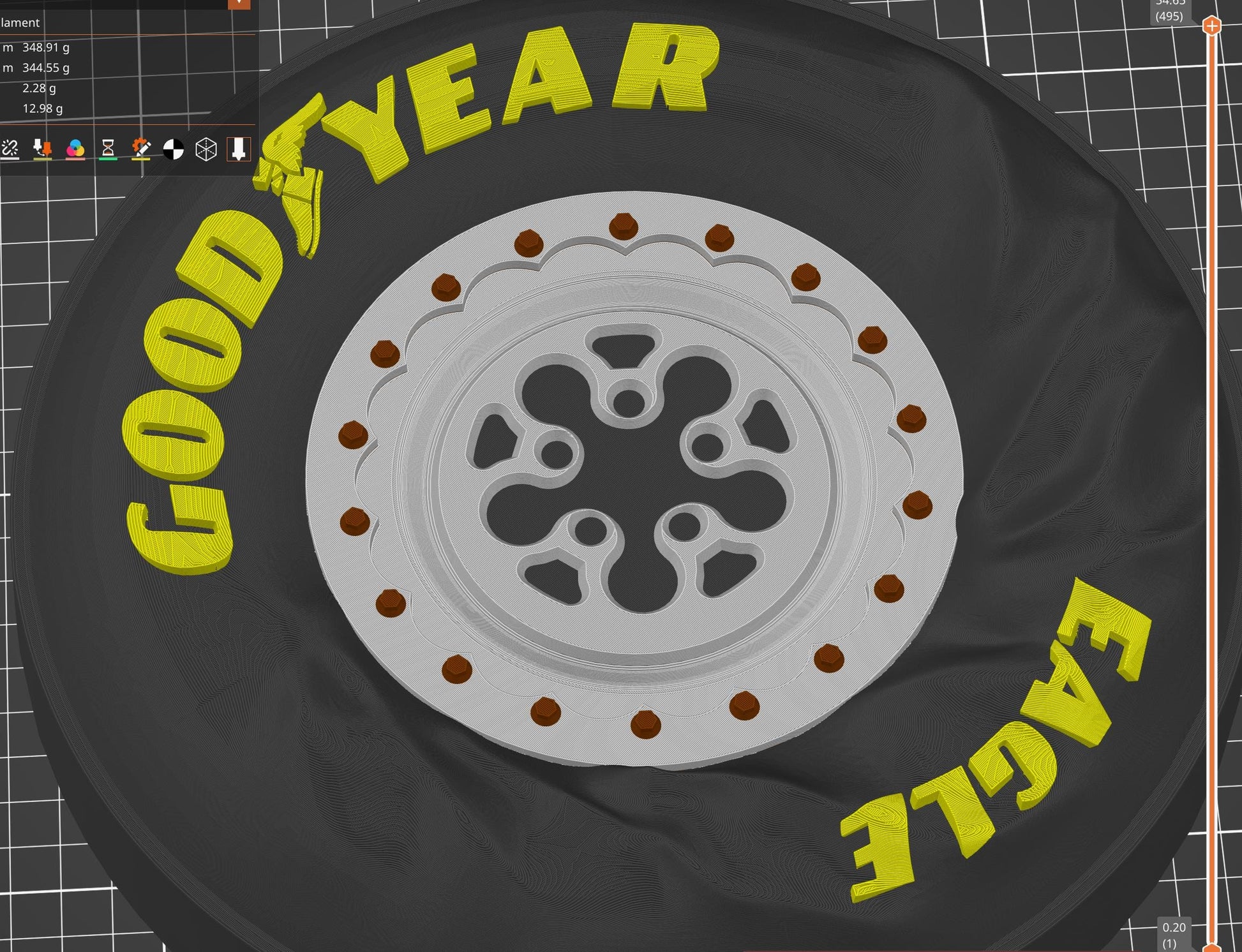 The tire face features realistic wrinkle sculpting at the lower rear — mimicking the compressed sidewall of a drag tire under extreme acceleration.